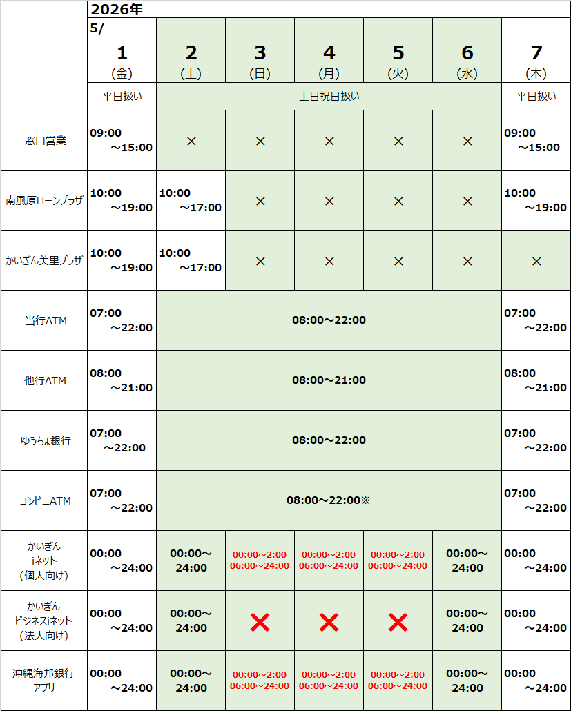 ゴールデンウィーク期間中の窓口・ATM等の営業案内