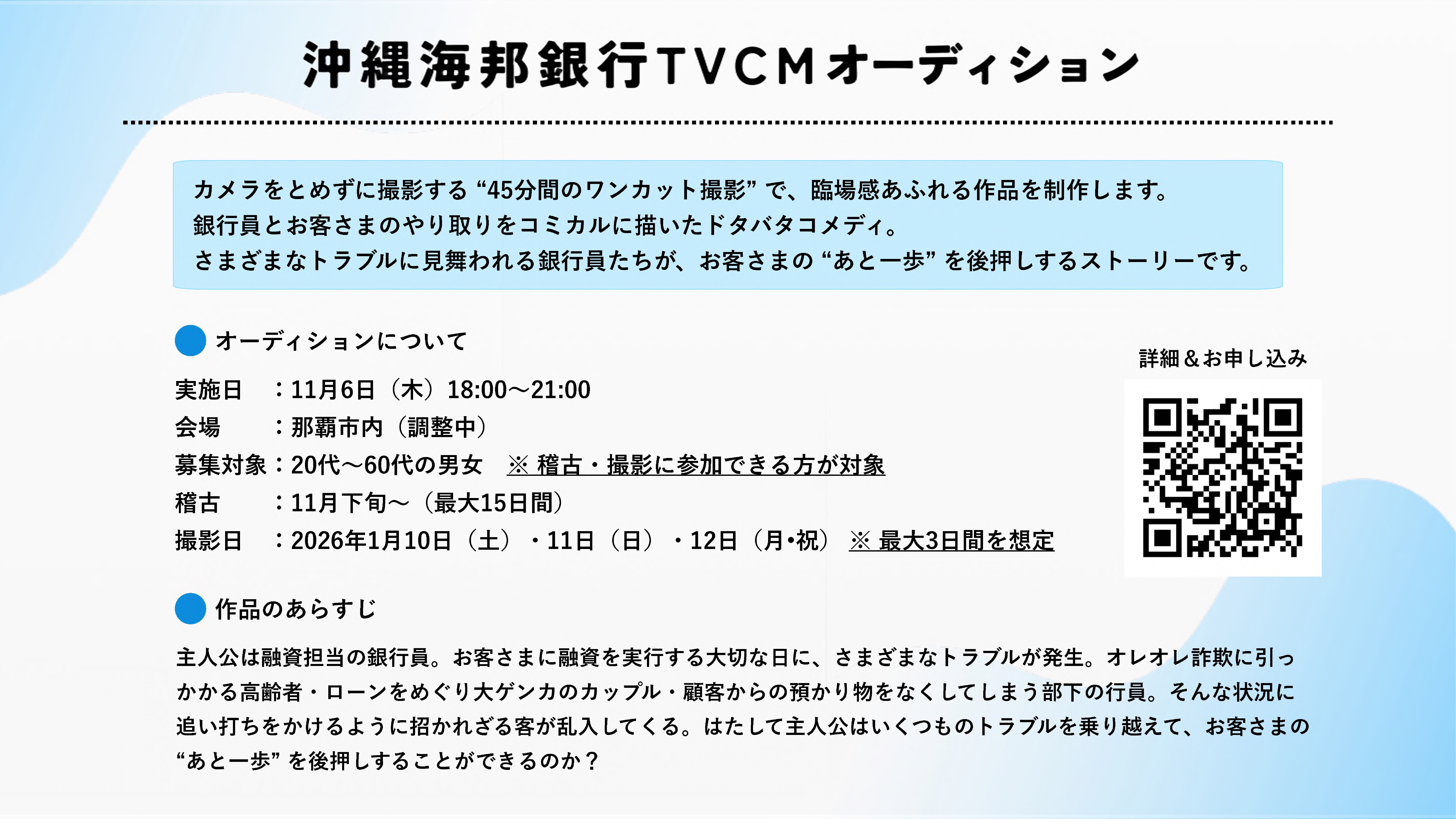 つきましては、当行のCMに出演していただける方を広く募集するべく、出演者オーディションを開催いたします。
