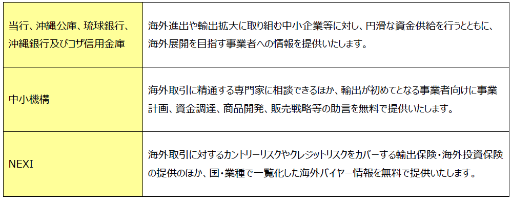 海外ビジネス支援パッケージ(沖縄)は、当行、沖縄公庫、琉球銀行、沖縄銀行、コザ信用金庫、中小機構及びNEXI により構築された連携支援体制で、中小企業等の海外販路拡大のため有用な支援策を各機関が持ち寄ることで、中小企業等の海外販路拡大に関する課題やニーズの把握からビジネスマッチング支援、事業計画策定支援、金融支援、リスク対応等を連携し途切れることなく支援いたします。