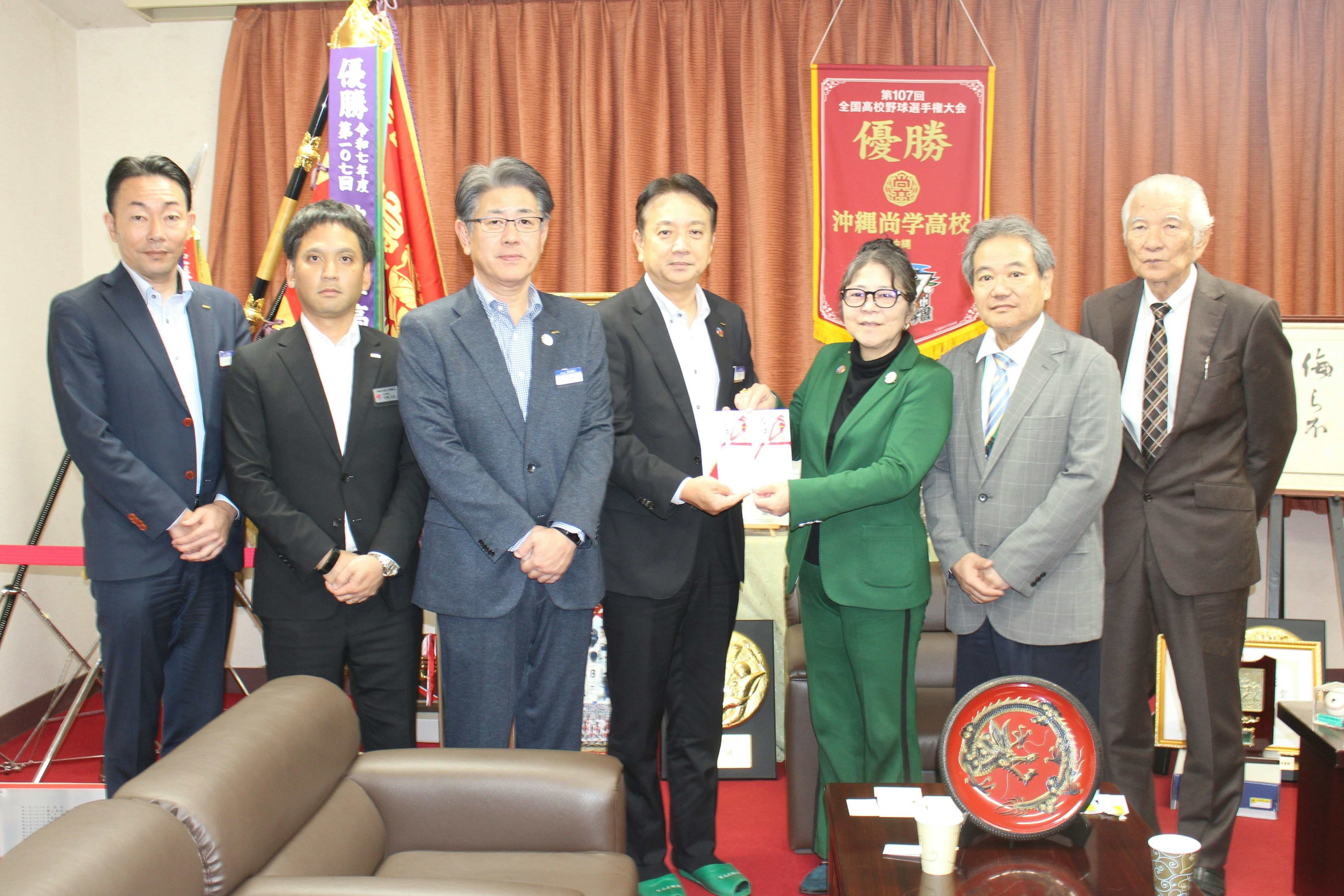 沖縄海邦銀行(頭取 新城 一史)は、2月2日(月)、第98回選抜高等学校野球大会への出場が決定した沖縄尚学高等学校に対して、当行および海銀ボランティア基金(海邦コーラル倶楽部)より寄付金を贈呈いたしました。